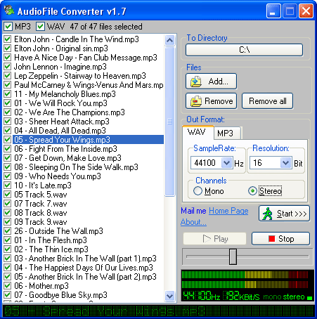 Основная функция AudioFilesConverter – массовое преобразование файлов между форматами MP3 и WAV. От Вас потребуется лишь указать исходные файлы и папку, куда будут добавляться готовые композиции. Для MP3-формата можно выставить переменный (variable) или постоянный (constant: 32-320 кбит/сек) битрейт, для WMA регулируется частота дискретизации (SampleRate: 6-96 кГц), размер аудио образца (Resolution: 8-16 бит) и количество каналов (Channels: Mono, Stereo). Имеется простенький встроенный проигрыватель. Говорить что-либо о дизайне трудно, так как его, в принципе, нет. Стандартное окошко, вкладки, кнопки... Хотя, это сложно отнести к недостаткам программы, ведь главное здесь – простота и наглядность. Сомневаюсь, что AudioFilesConverter сможет претендовать на первое место среди музыкальных конверторов, но своих пользователей программа, безусловно, найдет, особенно учитывая её бесплатность. Программу можно скачать с оффициально сайта.